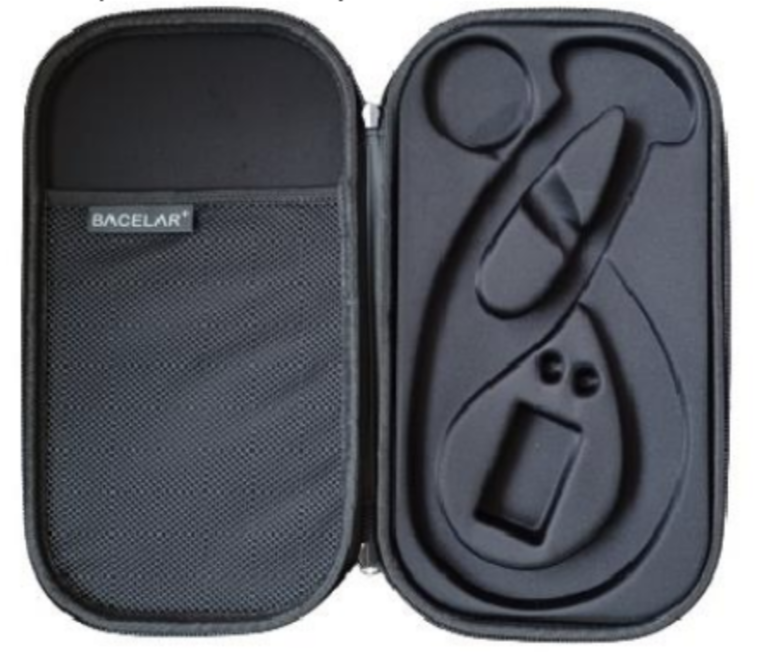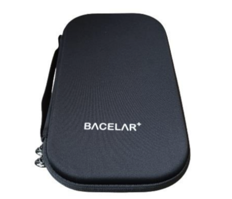 • Estojo rígido preto com texto BACELAR+.