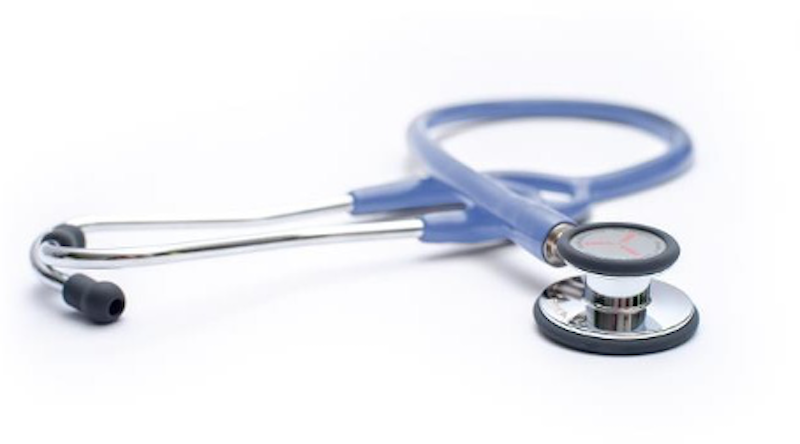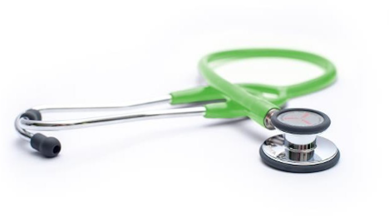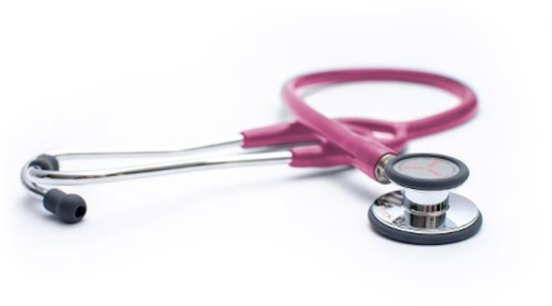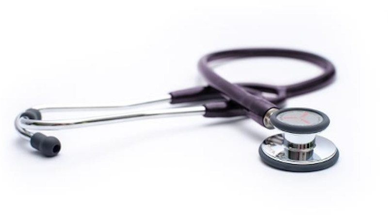 • Estetoscópio roxo com campânula metálica sobre fundo branco