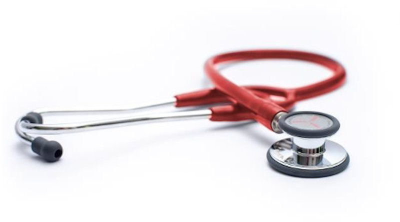 • Estetoscópio vermelho e prateado sobre fundo branco
