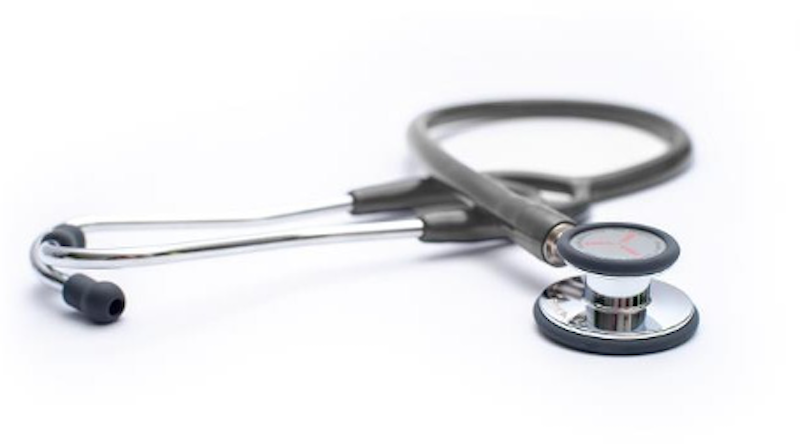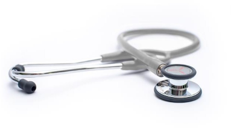 • Estetoscópio metálico e cinzento claro sobre fundo branco