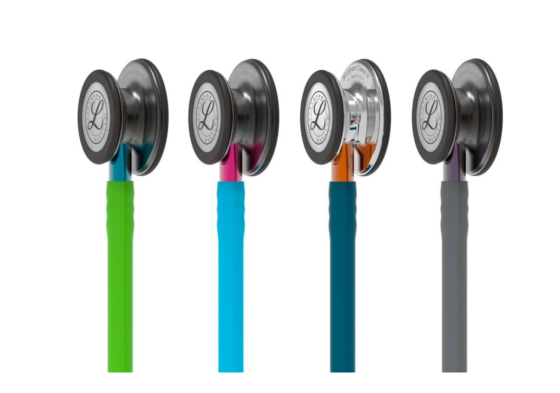 • Quatro estetoscópios com tubos coloridos e fones metálicos com logotipo preto