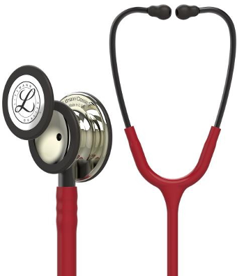 • Estetoscópio vermelho com metal prateado e preto, texto 'LITTMANN CLASSIC III' no diafragma