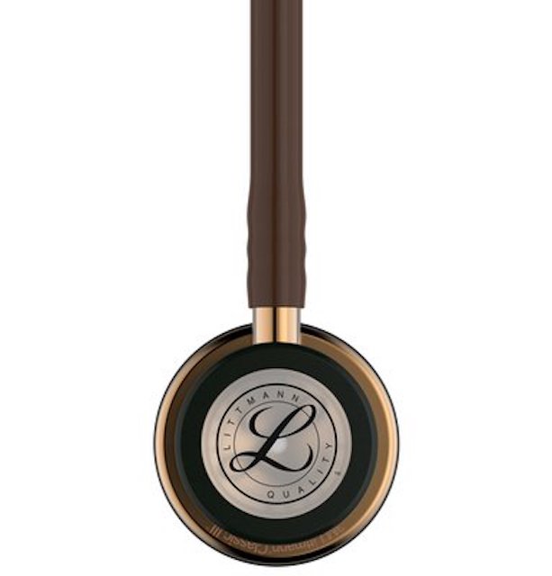 Estetoscópio com peças em castanho, preto, prateado e dourado com texto LITTMMANN QUALITY