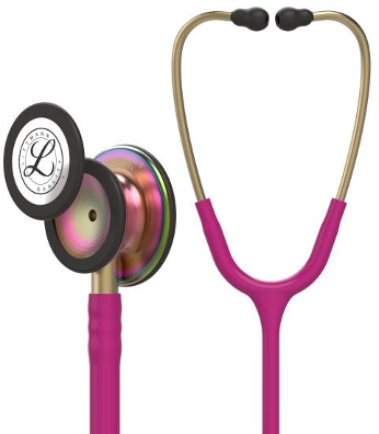 • Estetoscópio rosa com acabamento metálico iridescente e texto L no diafragma