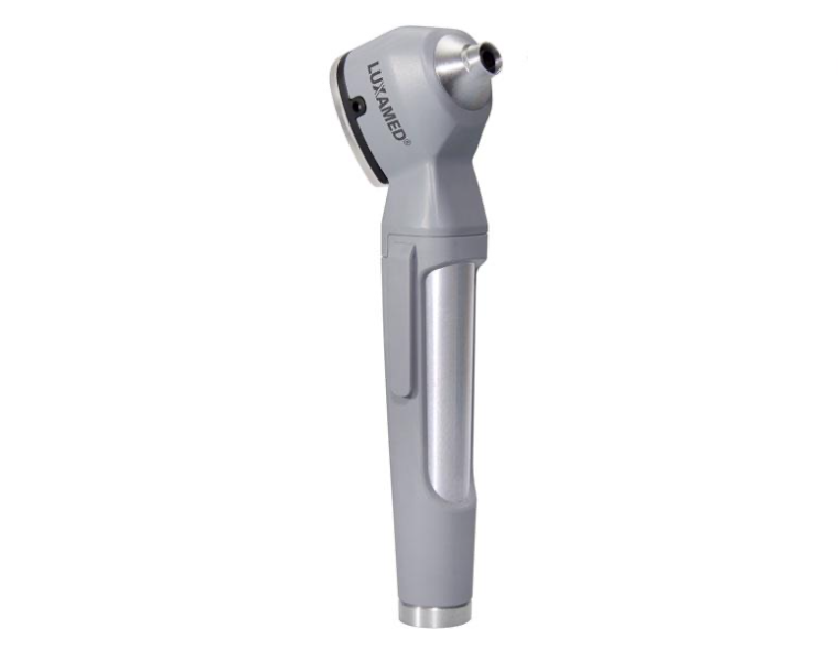 • Otoscópio médico cinza com detalhes prateados e texto LUZAMED