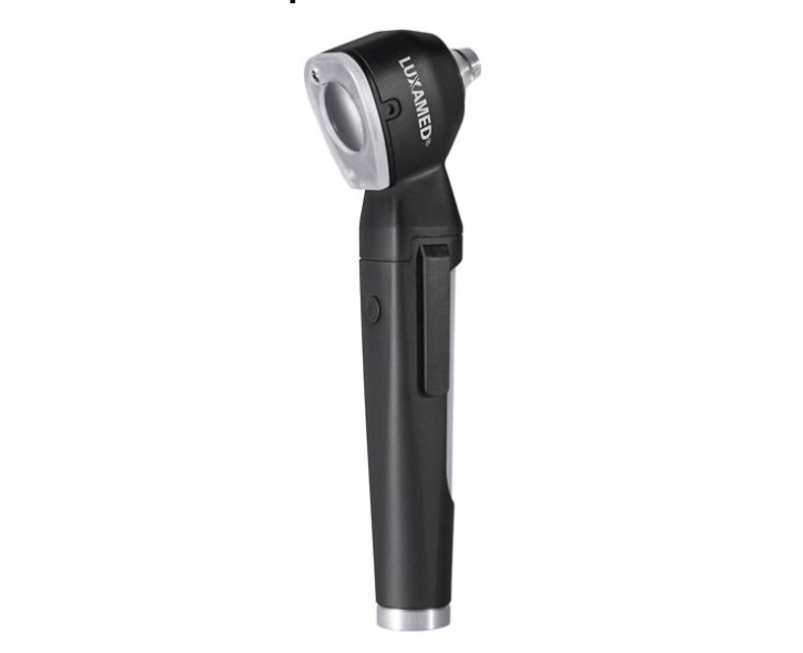 • Otoscópio preto com detalhes prateados com a palavra LUZAMED